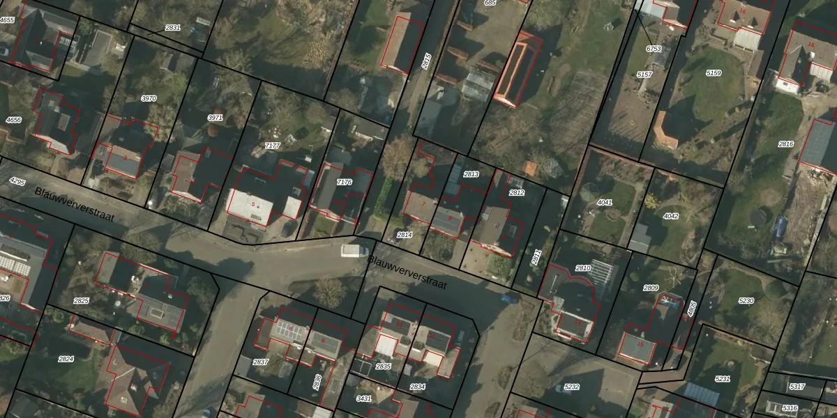 Blauwververstraat 7 is gelegen op kadastraal perceel HDN01G2814. Deze kadastrale aanduiding is uniek en wordt gebruikt door het Kadaster om eigendomsrechten en andere zakelijke rechten vast te leggen. Het perceel maakt onderdeel uit van de kadastrale gemeente Helden.
