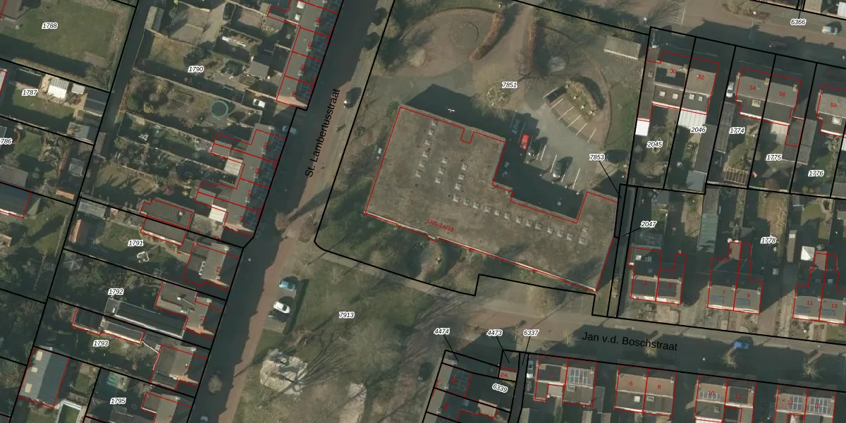 Het perceel waarop Jan v.d. Boschstraat 1-A-1 staat heeft een oppervlakte van 4406 m². Dit is een zeer groot perceel. De perceeloppervlakte wordt geregistreerd door het Kadaster. Gedetailleerde informatie over de maten van dit perceel kunt u vinden in het rapport Kadastrale kaart met maatvoering van Jan v.d. Boschstraat 1-A-1.