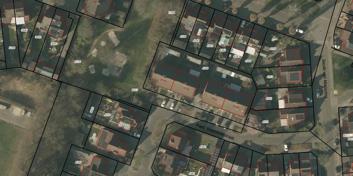 Het perceel waarop Past. Hoemoetstraat 49 staat heeft een oppervlakte van 1696 m². Dit is een zeer groot perceel. De perceeloppervlakte wordt geregistreerd door het Kadaster. Gedetailleerde informatie over de maten van dit perceel kunt u vinden in het rapport Kadastrale kaart met maatvoering van Past. Hoemoetstraat 49.