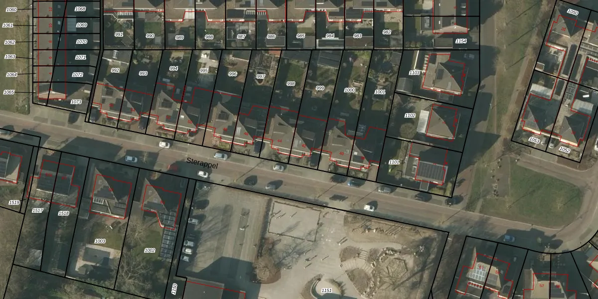Het perceel waarop Sterappel 42 staat heeft een oppervlakte van 403 m². Dit is een groot perceel. De perceeloppervlakte wordt geregistreerd door het Kadaster. Gedetailleerde informatie over de maten van dit perceel kunt u vinden in het rapport Kadastrale kaart met maatvoering van Sterappel 42.