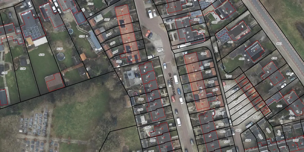 Het perceel waarop de Matestraat 18 staat heeft een oppervlakte van 555 m². Dit is een groot perceel. De perceeloppervlakte wordt geregistreerd door het Kadaster. Gedetailleerde informatie over de maten van dit perceel kunt u vinden in het rapport Kadastrale kaart met maatvoering van de Matestraat 18.