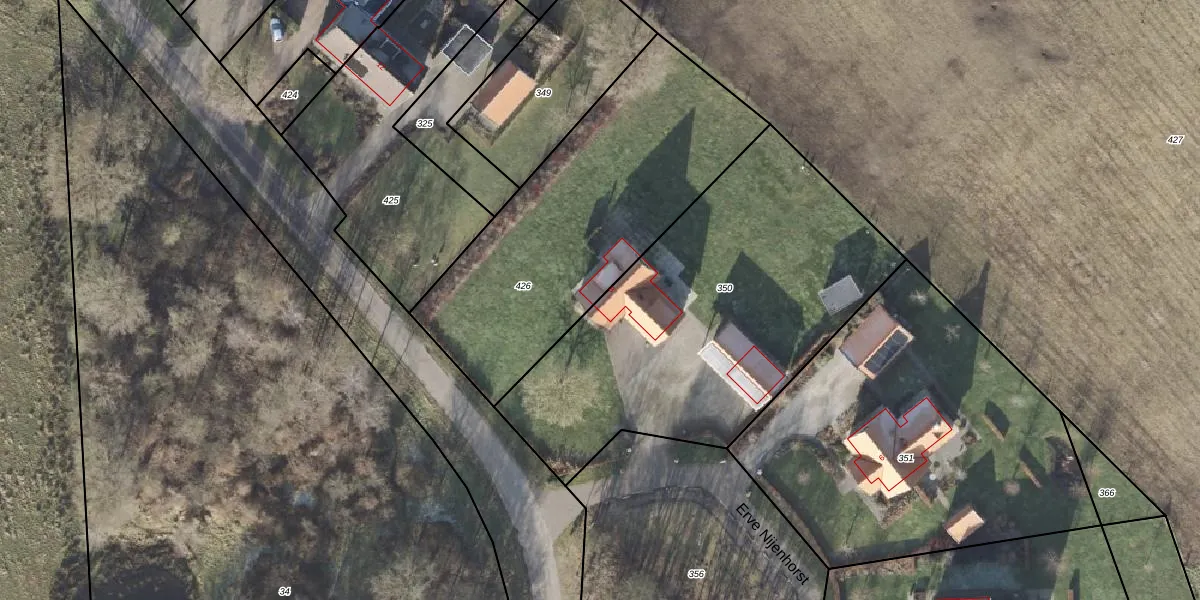 Het perceel waarop Erve Nijenhorst 8 staat heeft een oppervlakte van 1885 m². Dit is een zeer groot perceel. De perceeloppervlakte wordt geregistreerd door het Kadaster. Gedetailleerde informatie over de maten van dit perceel kunt u vinden in het rapport Kadastrale kaart met maatvoering van Erve Nijenhorst 8.