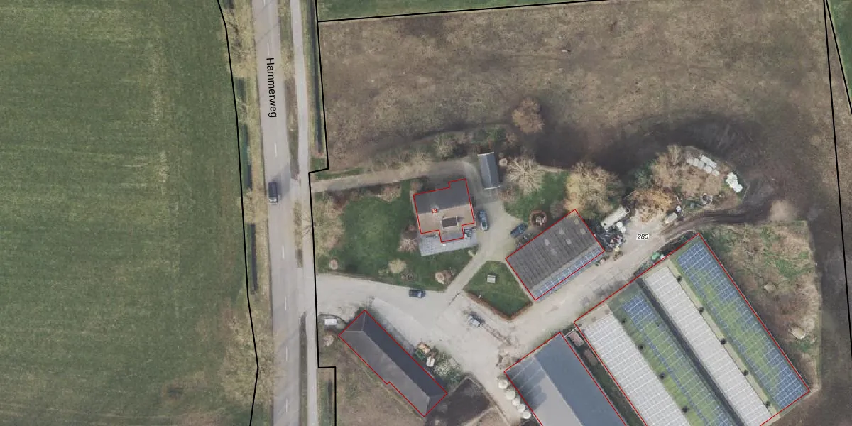 Het perceel waarop Hammerweg 18 staat heeft een oppervlakte van 2,1 ha. Dit is een zeer groot perceel. De perceeloppervlakte wordt geregistreerd door het Kadaster. Gedetailleerde informatie over de maten van dit perceel kunt u vinden in het rapport Kadastrale kaart met maatvoering van Hammerweg 18.