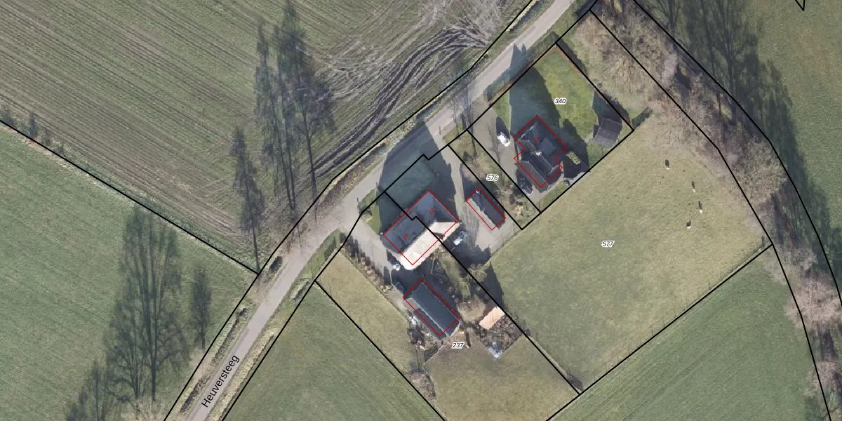 Het perceel waarop Heuversteeg 12 staat heeft een oppervlakte van 3303 m². Dit is een zeer groot perceel. De perceeloppervlakte wordt geregistreerd door het Kadaster. Gedetailleerde informatie over de maten van dit perceel kunt u vinden in het rapport Kadastrale kaart met maatvoering van Heuversteeg 12.