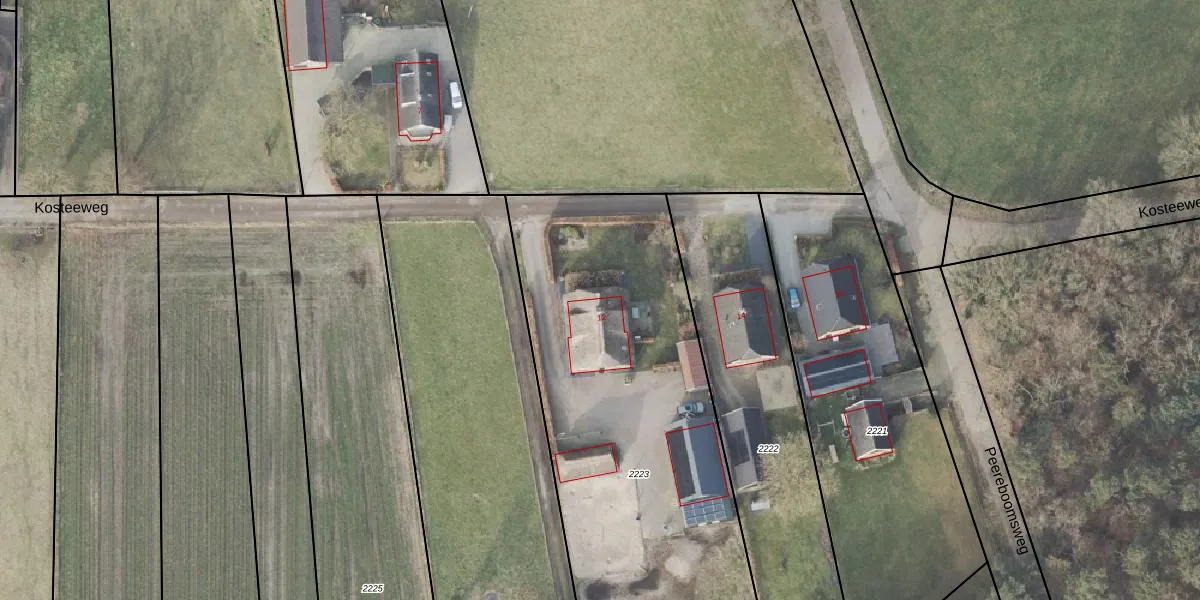 Kosteeweg 12 is gelegen op kadastraal perceel HLD01G2223. Deze kadastrale aanduiding is uniek en wordt gebruikt door het Kadaster om eigendomsrechten en andere zakelijke rechten vast te leggen. Het perceel maakt onderdeel uit van de kadastrale gemeente Hellendoorn.
