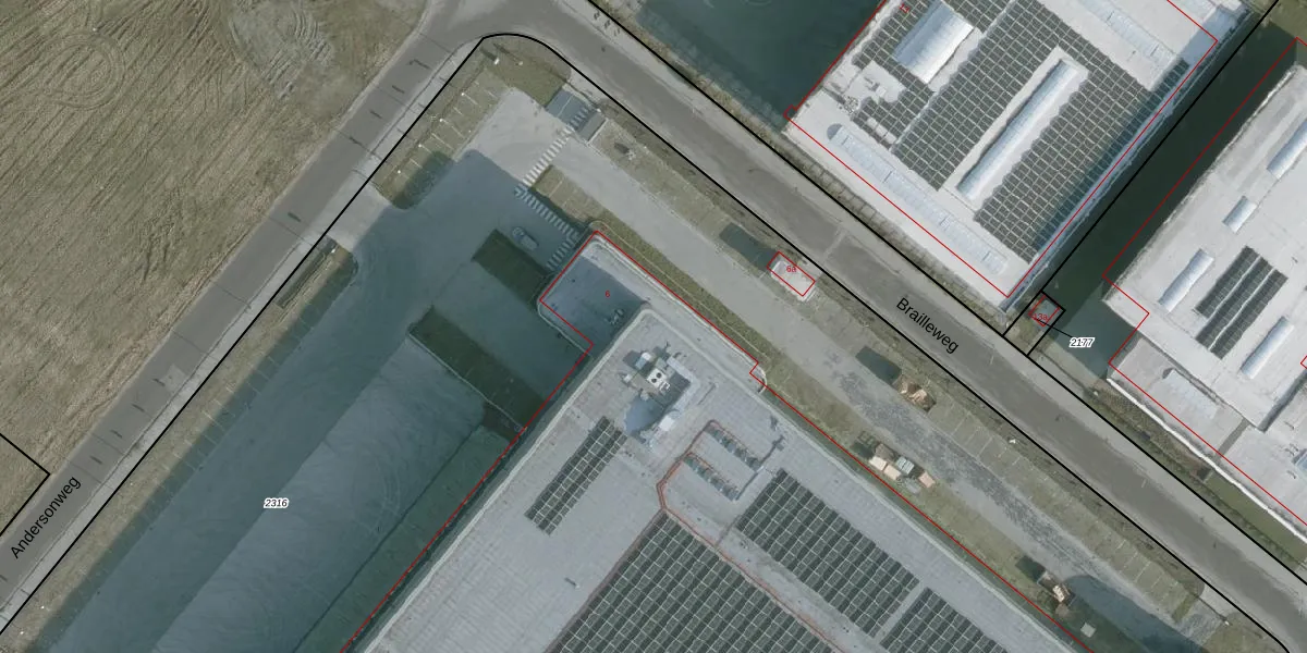 Het perceel waarop Brailleweg 6 staat heeft een oppervlakte van 2,5 ha. Dit is een zeer groot perceel. De perceeloppervlakte wordt geregistreerd door het Kadaster. Gedetailleerde informatie over de maten van dit perceel kunt u vinden in het rapport Kadastrale kaart met maatvoering van Brailleweg 6.