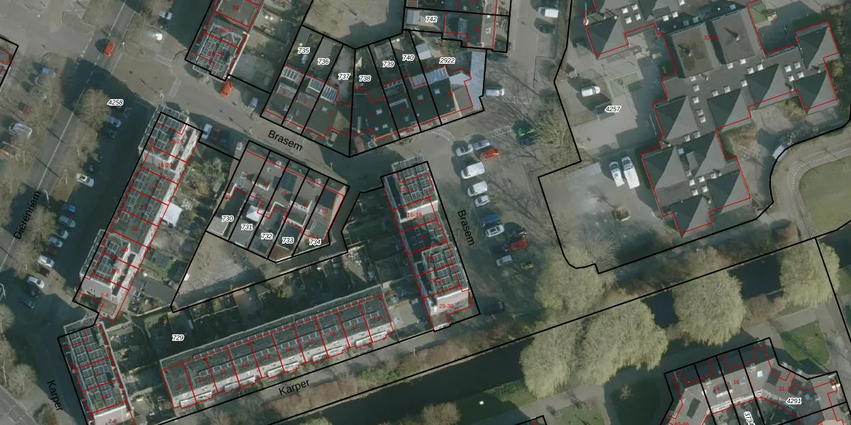 Het perceel waarop Brasem 18 staat heeft een oppervlakte van 3660 m². Dit is een zeer groot perceel. De perceeloppervlakte wordt geregistreerd door het Kadaster. Gedetailleerde informatie over de maten van dit perceel kunt u vinden in het rapport Kadastrale kaart met maatvoering van Brasem 18.