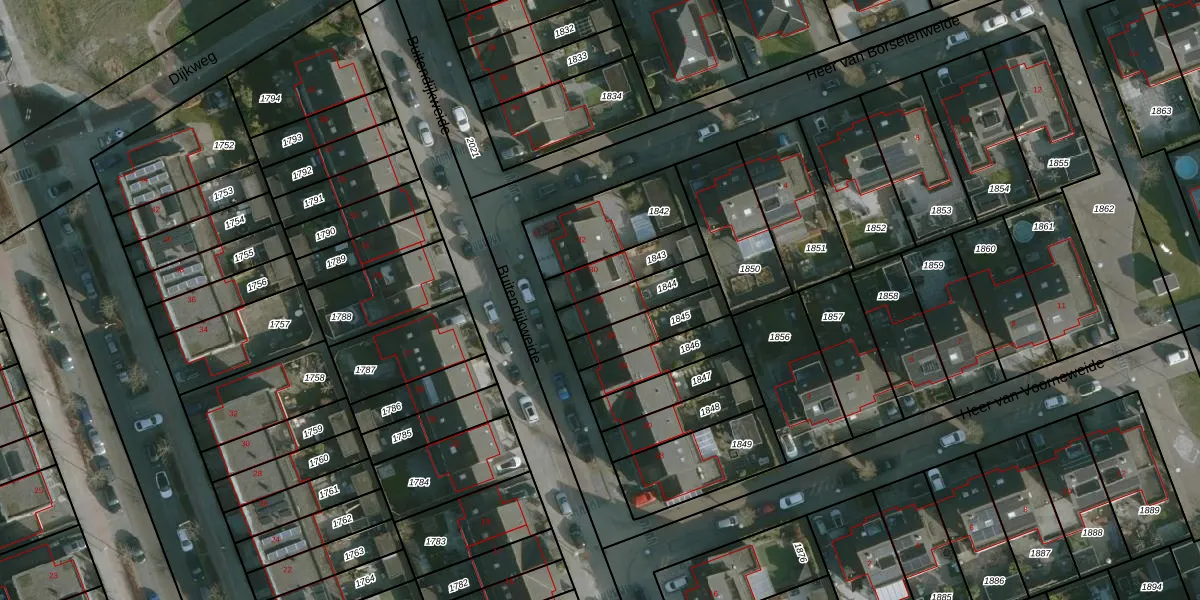 Buitendijkweide 28 is gelegen op kadastraal perceel HLV01H1844. Deze kadastrale aanduiding is uniek en wordt gebruikt door het Kadaster om eigendomsrechten en andere zakelijke rechten vast te leggen. Het perceel maakt onderdeel uit van de kadastrale gemeente Hellevoetsluis.