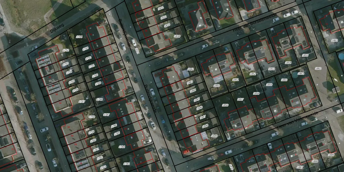 Buitendijkweide 30 is gelegen op kadastraal perceel HLV01H1843. Deze kadastrale aanduiding is uniek en wordt gebruikt door het Kadaster om eigendomsrechten en andere zakelijke rechten vast te leggen. Het perceel maakt onderdeel uit van de kadastrale gemeente Hellevoetsluis.