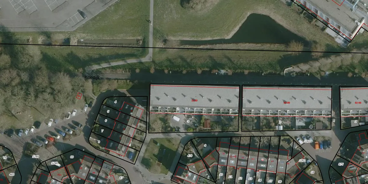 Het perceel waarop Koedijk 20 staat heeft een oppervlakte van 1260 m². Dit is een zeer groot perceel. De perceeloppervlakte wordt geregistreerd door het Kadaster. Gedetailleerde informatie over de maten van dit perceel kunt u vinden in het rapport Kadastrale kaart met maatvoering van Koedijk 20.
