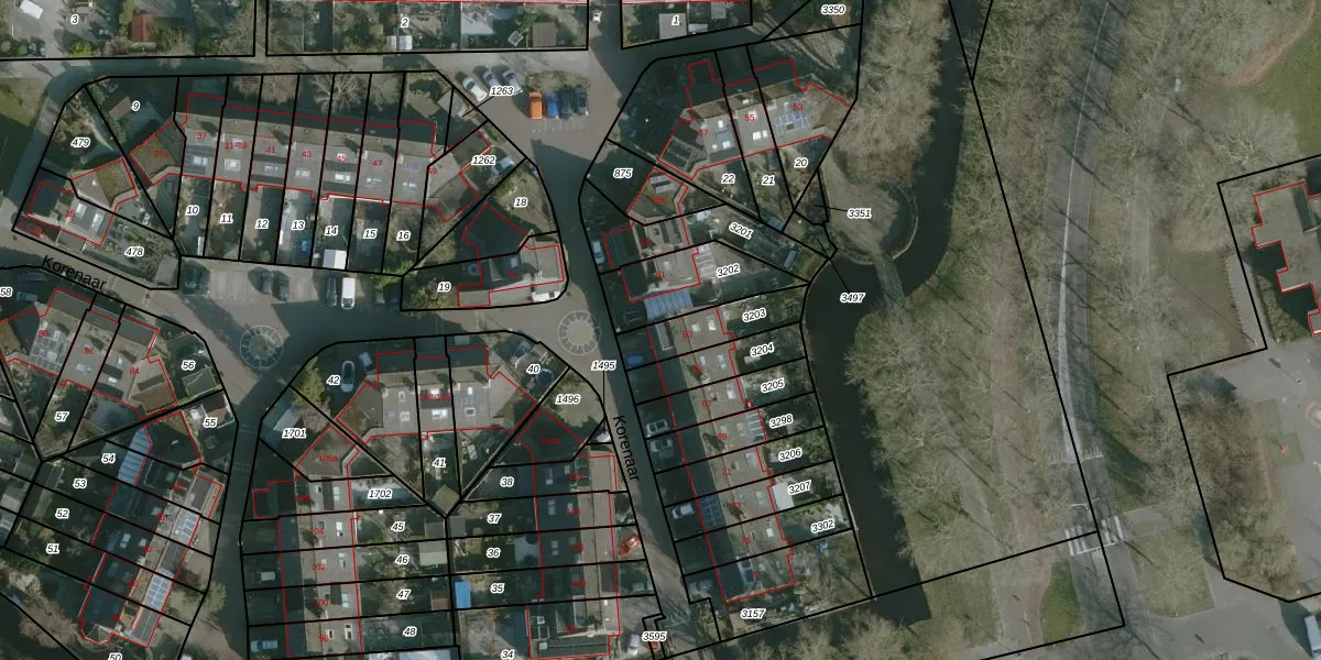Het perceel waarop Korenaar 63 staat heeft een oppervlakte van 163 m². Dit is een middelgroot perceel. De perceeloppervlakte wordt geregistreerd door het Kadaster. Gedetailleerde informatie over de maten van dit perceel kunt u vinden in het rapport Kadastrale kaart met maatvoering van Korenaar 63.