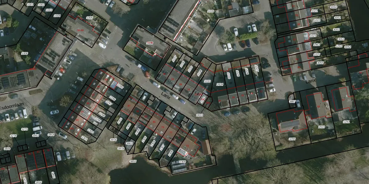 Het perceel waarop Larix 24 staat heeft een oppervlakte van 124 m². Dit is een middelgroot perceel. De perceeloppervlakte wordt geregistreerd door het Kadaster. Gedetailleerde informatie over de maten van dit perceel kunt u vinden in het rapport Kadastrale kaart met maatvoering van Larix 24.