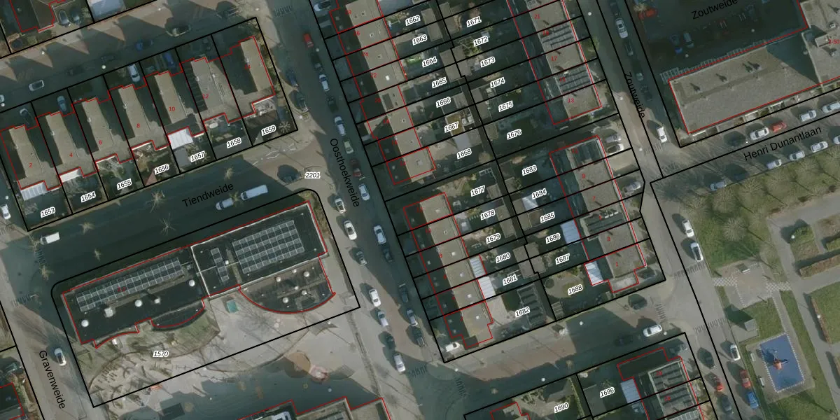 Oosthoekweide 12 is gelegen op kadastraal perceel HLV01H1677. Deze kadastrale aanduiding is uniek en wordt gebruikt door het Kadaster om eigendomsrechten en andere zakelijke rechten vast te leggen. Het perceel maakt onderdeel uit van de kadastrale gemeente Hellevoetsluis.