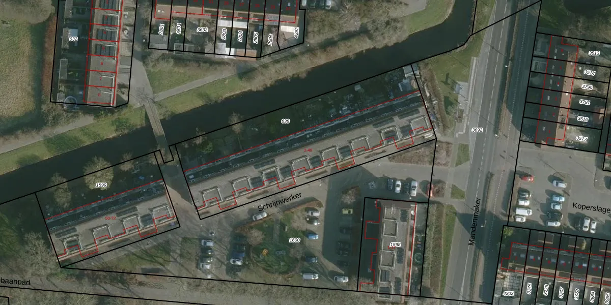 Het perceel waarop Schrijnwerker 24 staat heeft een oppervlakte van 2085 m². Dit is een zeer groot perceel. De perceeloppervlakte wordt geregistreerd door het Kadaster. Gedetailleerde informatie over de maten van dit perceel kunt u vinden in het rapport Kadastrale kaart met maatvoering van Schrijnwerker 24.