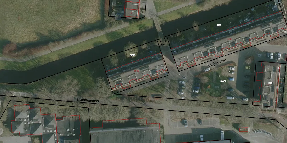 Het perceel waarop Schrijnwerker 66 staat heeft een oppervlakte van 1054 m². Dit is een zeer groot perceel. De perceeloppervlakte wordt geregistreerd door het Kadaster. Gedetailleerde informatie over de maten van dit perceel kunt u vinden in het rapport Kadastrale kaart met maatvoering van Schrijnwerker 66.