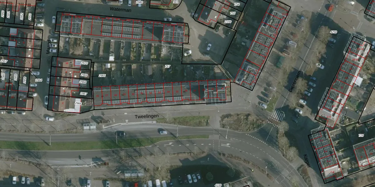 Het perceel waarop Tweelingen 36 staat heeft een oppervlakte van 4270 m². Dit is een zeer groot perceel. De perceeloppervlakte wordt geregistreerd door het Kadaster. Gedetailleerde informatie over de maten van dit perceel kunt u vinden in het rapport Kadastrale kaart met maatvoering van Tweelingen 36.