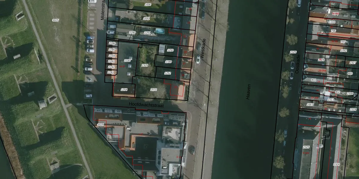 Westkade 13 is gelegen op kadastraal perceel HLV01A2070. Deze kadastrale aanduiding is uniek en wordt gebruikt door het Kadaster om eigendomsrechten en andere zakelijke rechten vast te leggen. Het perceel maakt onderdeel uit van de kadastrale gemeente Hellevoetsluis.