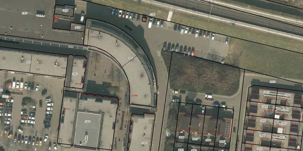 Het perceel waarop Amer 21 staat heeft een oppervlakte van 1262 m². Dit is een zeer groot perceel. De perceeloppervlakte wordt geregistreerd door het Kadaster. Gedetailleerde informatie over de maten van dit perceel kunt u vinden in het rapport Kadastrale kaart met maatvoering van Amer 21.