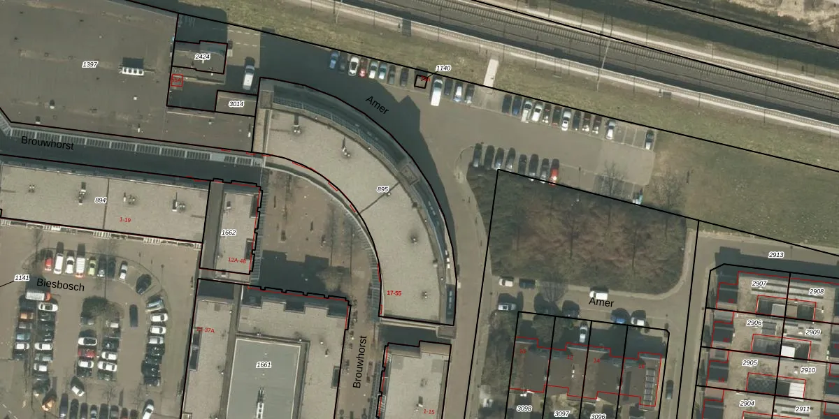 Het perceel waarop Amer 43 staat heeft een oppervlakte van 1262 m². Dit is een zeer groot perceel. De perceeloppervlakte wordt geregistreerd door het Kadaster. Gedetailleerde informatie over de maten van dit perceel kunt u vinden in het rapport Kadastrale kaart met maatvoering van Amer 43.