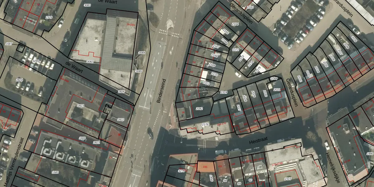Binderseind 38 is gelegen op kadastraal perceel HMD00I2314. Deze kadastrale aanduiding is uniek en wordt gebruikt door het Kadaster om eigendomsrechten en andere zakelijke rechten vast te leggen. Het perceel maakt onderdeel uit van de kadastrale gemeente Helmond.
