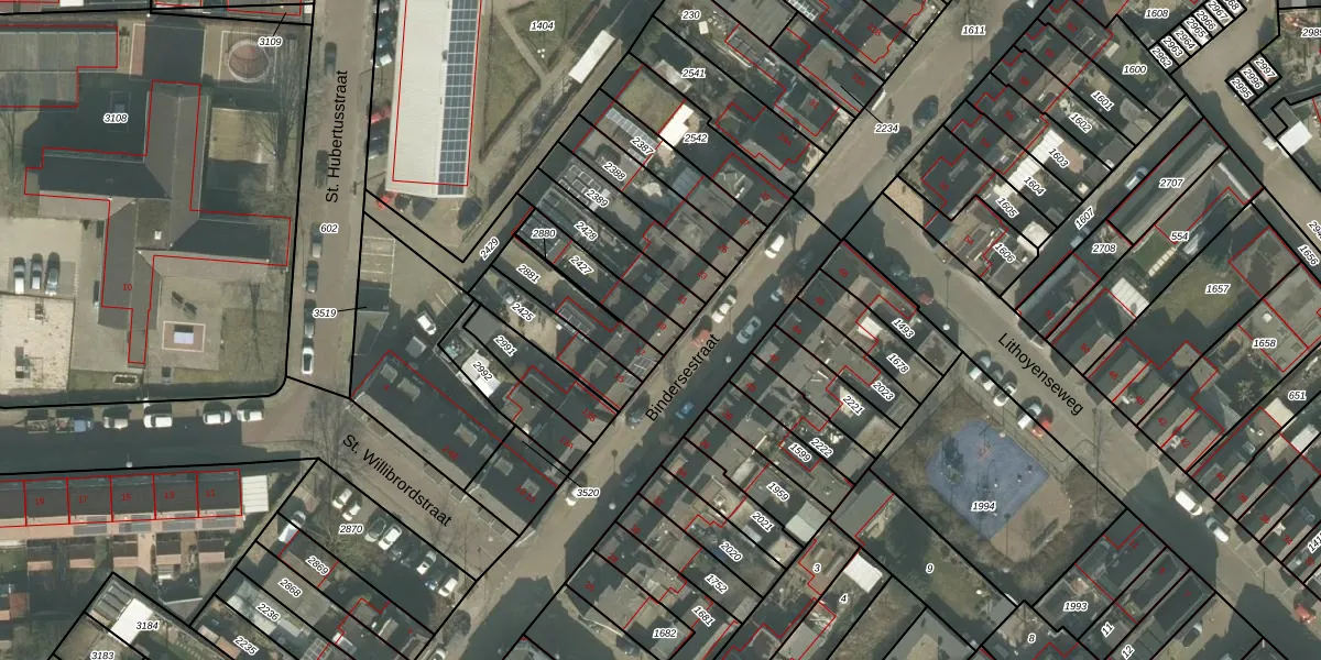 Bindersestraat 19 is gelegen op kadastraal perceel HMD00E2427. Deze kadastrale aanduiding is uniek en wordt gebruikt door het Kadaster om eigendomsrechten en andere zakelijke rechten vast te leggen. Het perceel maakt onderdeel uit van de kadastrale gemeente Helmond.