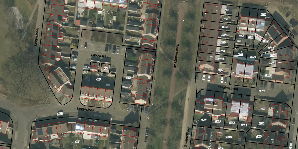 Het perceel waarop de Middenloop 101 staat heeft een oppervlakte van 733 m². Dit is een groot perceel. De perceeloppervlakte wordt geregistreerd door het Kadaster. Gedetailleerde informatie over de maten van dit perceel kunt u vinden in het rapport Kadastrale kaart met maatvoering van de Middenloop 101.