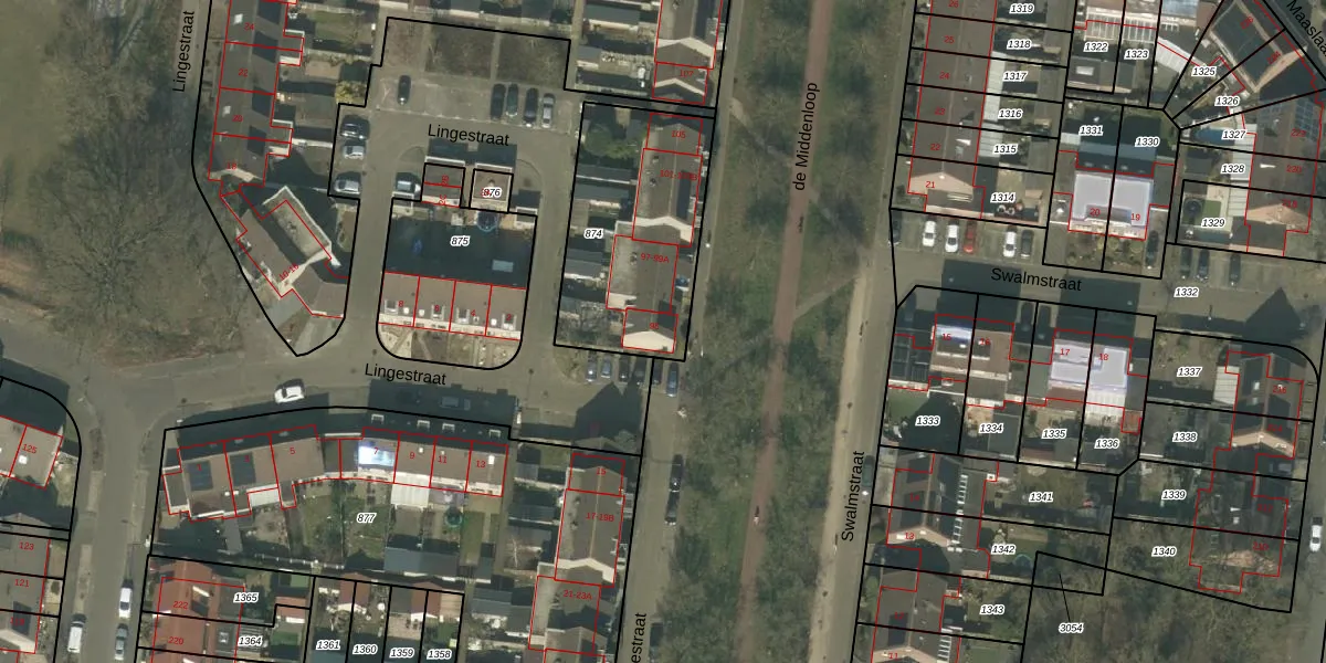 Het perceel waarop de Middenloop 95 staat heeft een oppervlakte van 733 m². Dit is een groot perceel. De perceeloppervlakte wordt geregistreerd door het Kadaster. Gedetailleerde informatie over de maten van dit perceel kunt u vinden in het rapport Kadastrale kaart met maatvoering van de Middenloop 95.