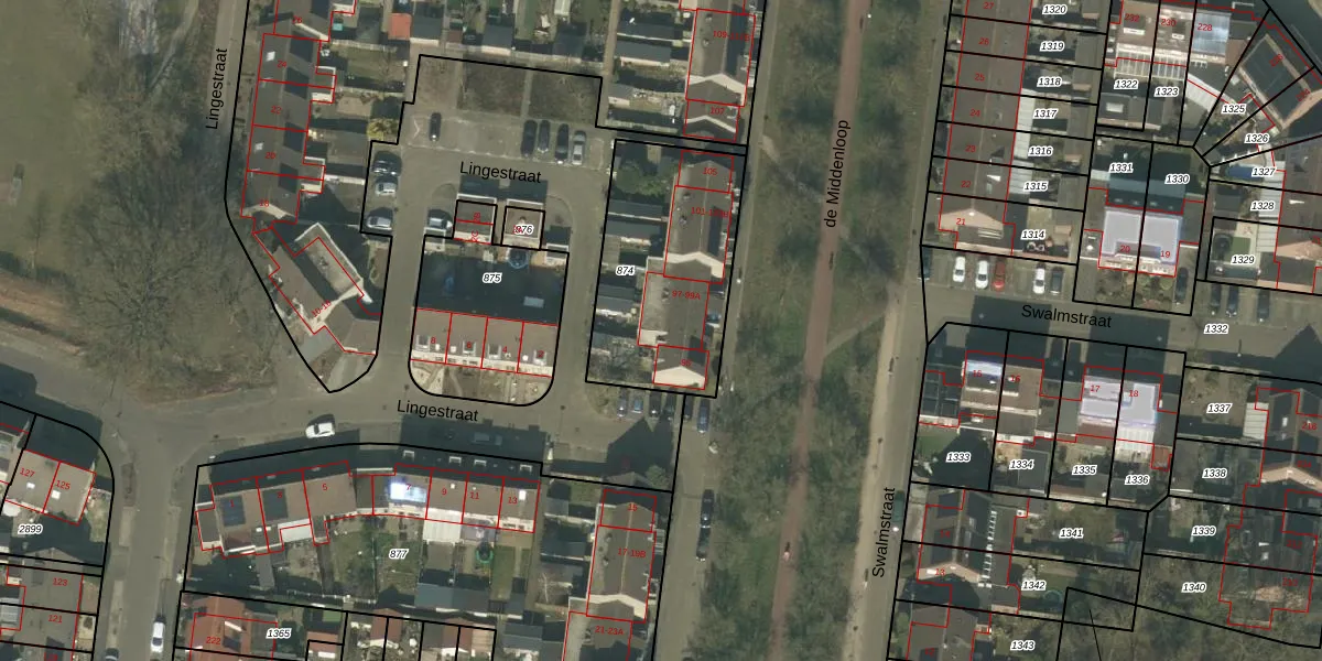 Het perceel waarop de Middenloop 97-A staat heeft een oppervlakte van 733 m². Dit is een groot perceel. De perceeloppervlakte wordt geregistreerd door het Kadaster. Gedetailleerde informatie over de maten van dit perceel kunt u vinden in het rapport Kadastrale kaart met maatvoering van de Middenloop 97-A.