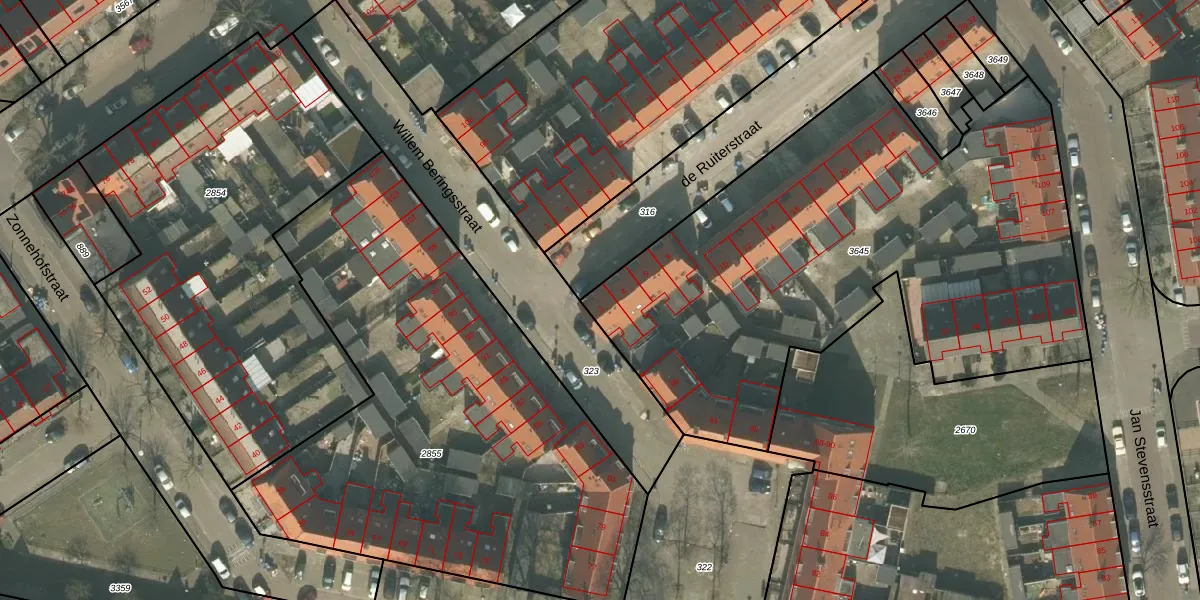 Het perceel waarop de Ruiterstraat 2 staat heeft een oppervlakte van 2980 m². Dit is een zeer groot perceel. De perceeloppervlakte wordt geregistreerd door het Kadaster. Gedetailleerde informatie over de maten van dit perceel kunt u vinden in het rapport Kadastrale kaart met maatvoering van de Ruiterstraat 2.