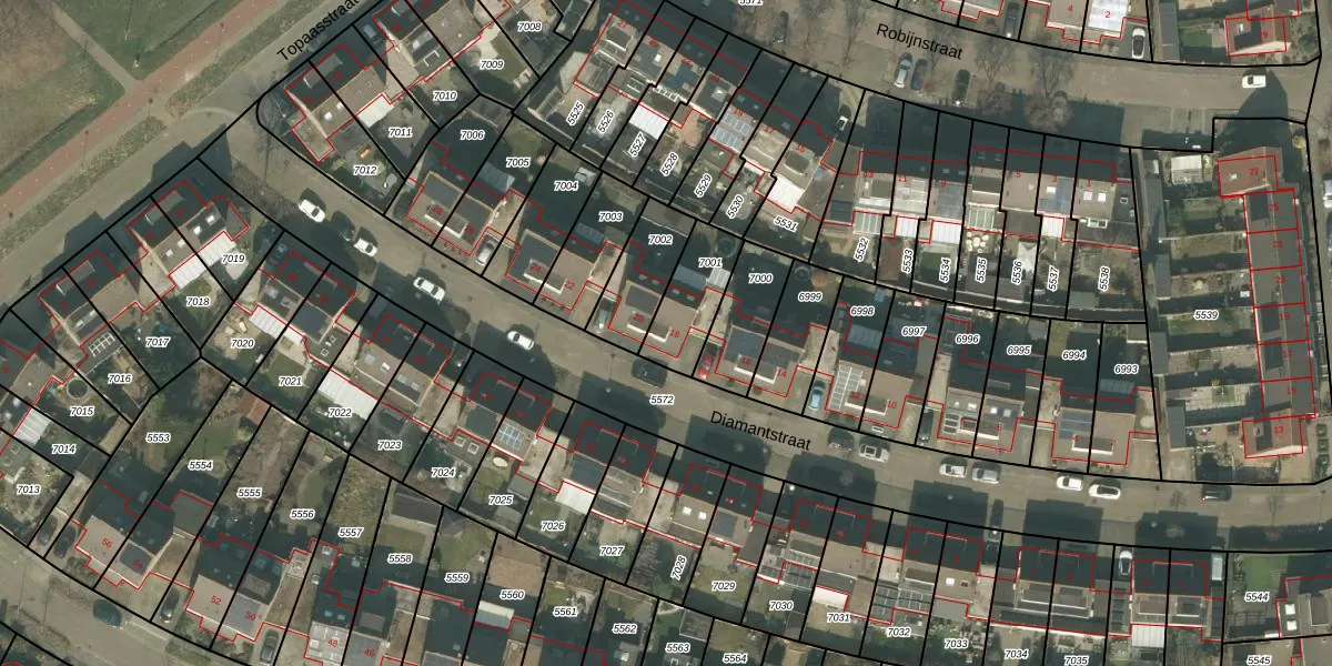 Het perceel waarop Diamantstraat 18 staat heeft een oppervlakte van 185 m². Dit is een middelgroot perceel. De perceeloppervlakte wordt geregistreerd door het Kadaster. Gedetailleerde informatie over de maten van dit perceel kunt u vinden in het rapport Kadastrale kaart met maatvoering van Diamantstraat 18.