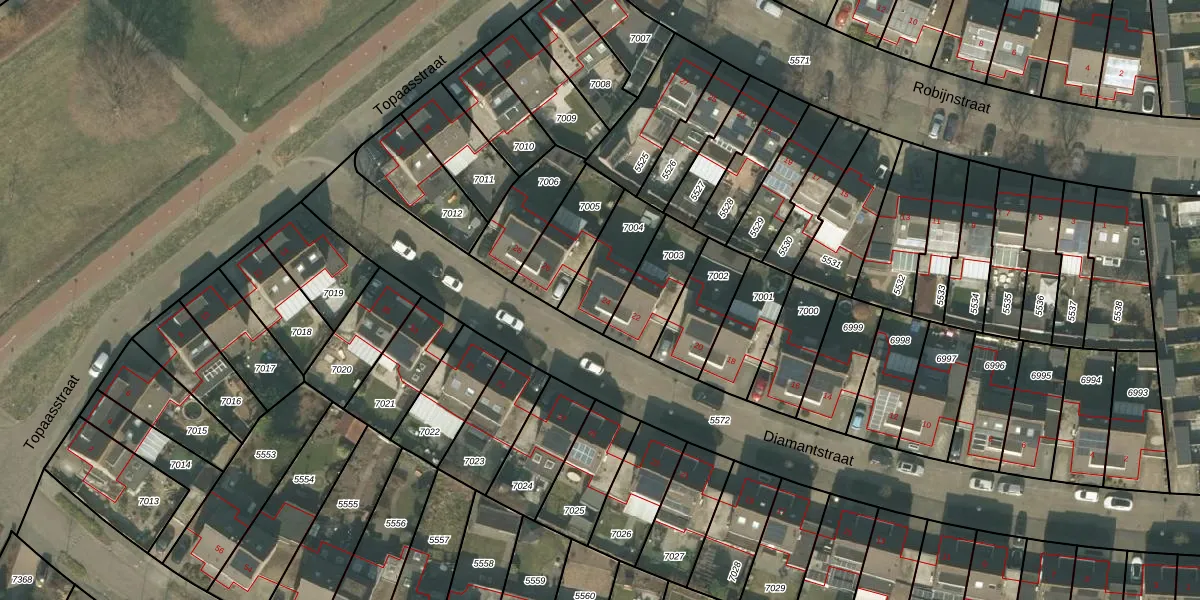 Het perceel waarop Diamantstraat 24 staat heeft een oppervlakte van 191 m². Dit is een middelgroot perceel. De perceeloppervlakte wordt geregistreerd door het Kadaster. Gedetailleerde informatie over de maten van dit perceel kunt u vinden in het rapport Kadastrale kaart met maatvoering van Diamantstraat 24.