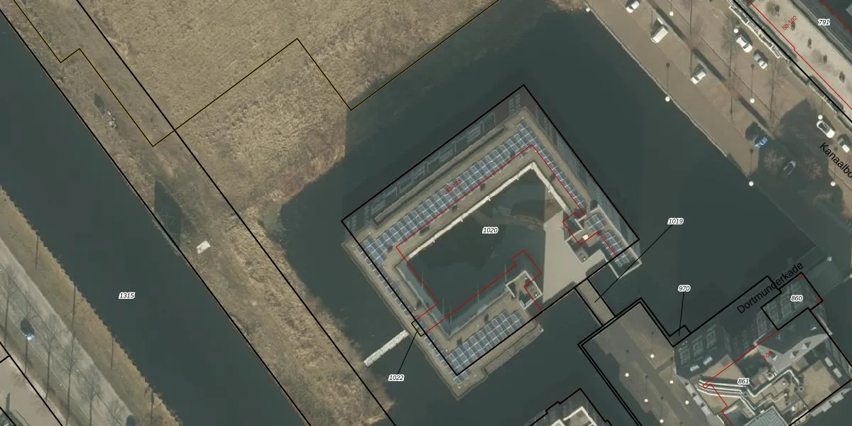 Het perceel waarop Dortmunderkade 119 staat heeft een oppervlakte van 2415 m². Dit is een zeer groot perceel. De perceeloppervlakte wordt geregistreerd door het Kadaster. Gedetailleerde informatie over de maten van dit perceel kunt u vinden in het rapport Kadastrale kaart met maatvoering van Dortmunderkade 119.