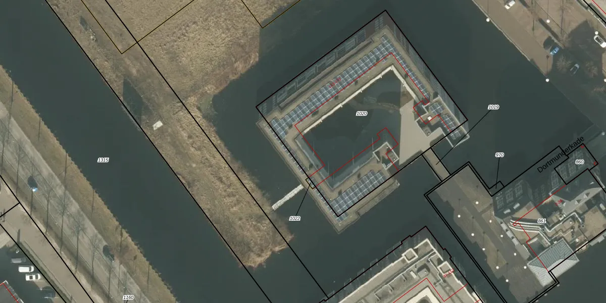 Het perceel waarop Dortmunderkade 140 staat heeft een oppervlakte van 2415 m². Dit is een zeer groot perceel. De perceeloppervlakte wordt geregistreerd door het Kadaster. Gedetailleerde informatie over de maten van dit perceel kunt u vinden in het rapport Kadastrale kaart met maatvoering van Dortmunderkade 140.