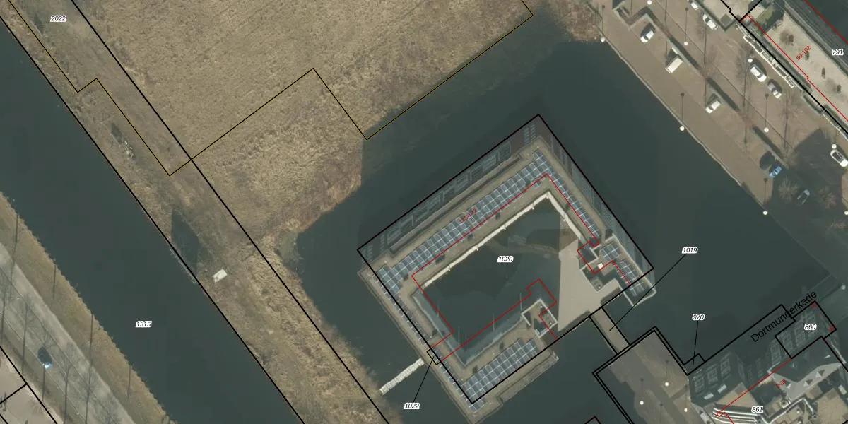 Het perceel waarop Dortmunderkade 155 staat heeft een oppervlakte van 2415 m². Dit is een zeer groot perceel. De perceeloppervlakte wordt geregistreerd door het Kadaster. Gedetailleerde informatie over de maten van dit perceel kunt u vinden in het rapport Kadastrale kaart met maatvoering van Dortmunderkade 155.