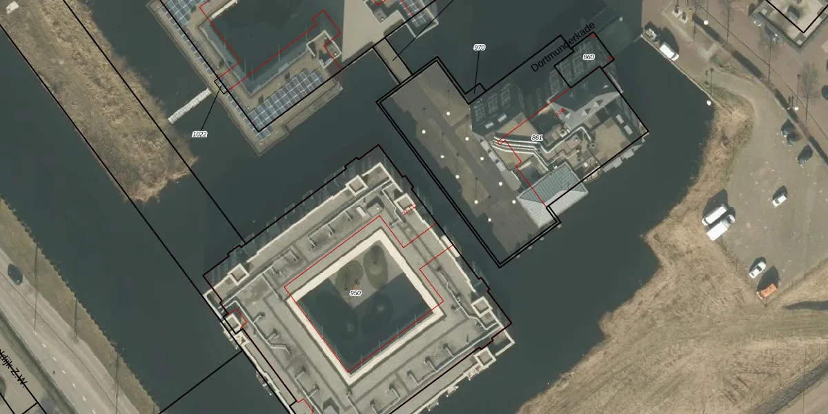 Het perceel waarop Dortmunderkade 37 staat heeft een oppervlakte van 2880 m². Dit is een zeer groot perceel. De perceeloppervlakte wordt geregistreerd door het Kadaster. Gedetailleerde informatie over de maten van dit perceel kunt u vinden in het rapport Kadastrale kaart met maatvoering van Dortmunderkade 37.