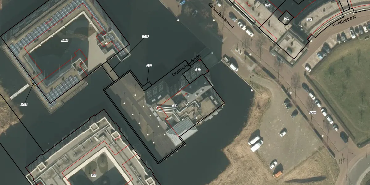Het perceel waarop Dortmunderkade 5 staat heeft een oppervlakte van 1719 m². Dit is een zeer groot perceel. De perceeloppervlakte wordt geregistreerd door het Kadaster. Gedetailleerde informatie over de maten van dit perceel kunt u vinden in het rapport Kadastrale kaart met maatvoering van Dortmunderkade 5.