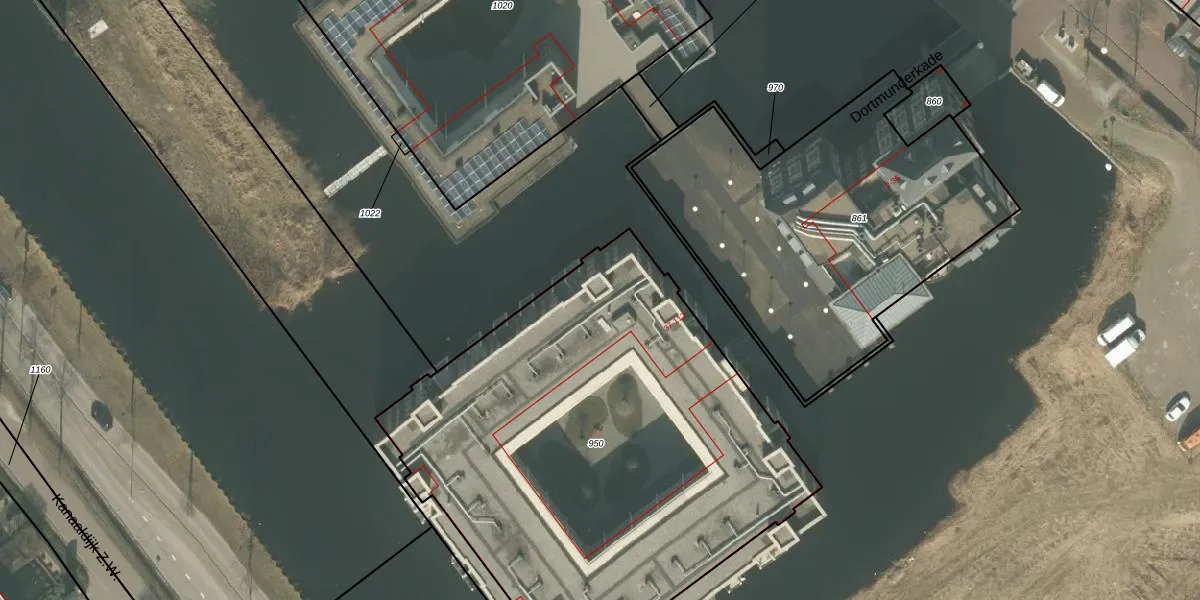 Het perceel waarop Dortmunderkade 54 staat heeft een oppervlakte van 2880 m². Dit is een zeer groot perceel. De perceeloppervlakte wordt geregistreerd door het Kadaster. Gedetailleerde informatie over de maten van dit perceel kunt u vinden in het rapport Kadastrale kaart met maatvoering van Dortmunderkade 54.