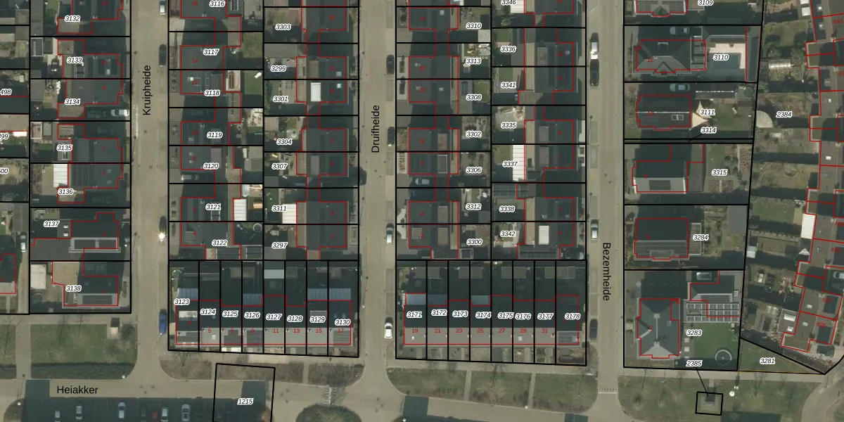 Het perceel waarop Druifheide 4 staat heeft een oppervlakte van 194 m². Dit is een middelgroot perceel. De perceeloppervlakte wordt geregistreerd door het Kadaster. Gedetailleerde informatie over de maten van dit perceel kunt u vinden in het rapport Kadastrale kaart met maatvoering van Druifheide 4.