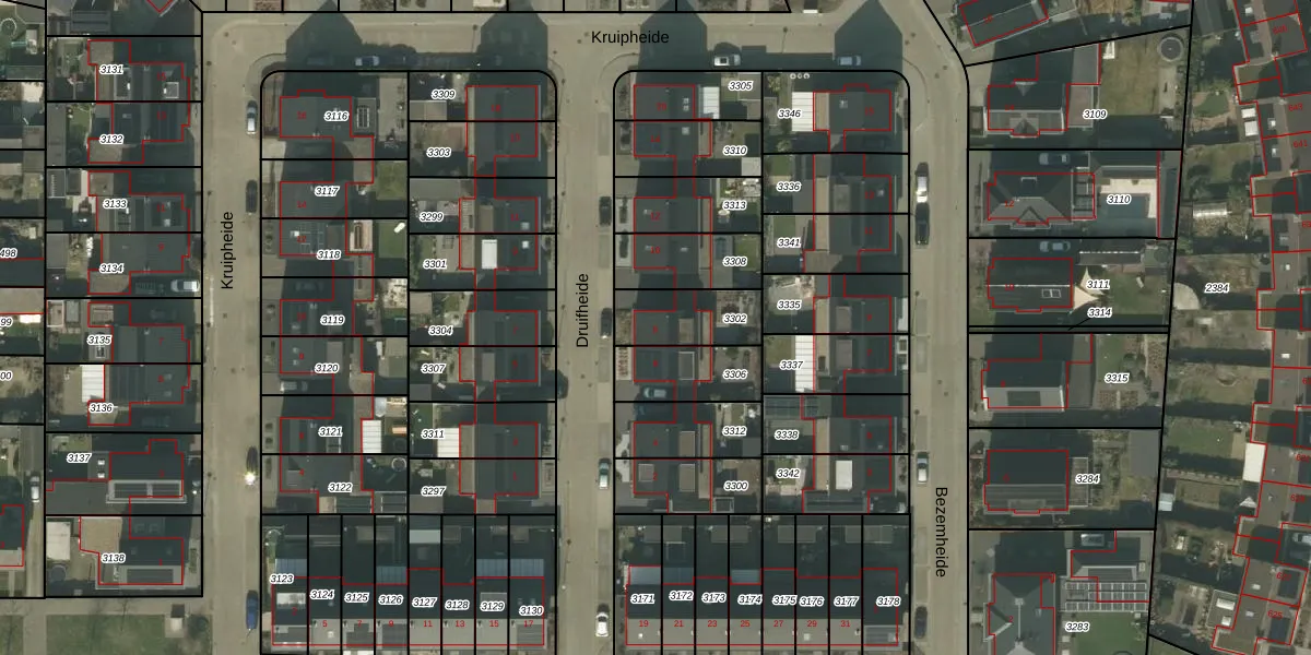 Het perceel waarop Druifheide 8 staat heeft een oppervlakte van 194 m². Dit is een middelgroot perceel. De perceeloppervlakte wordt geregistreerd door het Kadaster. Gedetailleerde informatie over de maten van dit perceel kunt u vinden in het rapport Kadastrale kaart met maatvoering van Druifheide 8.