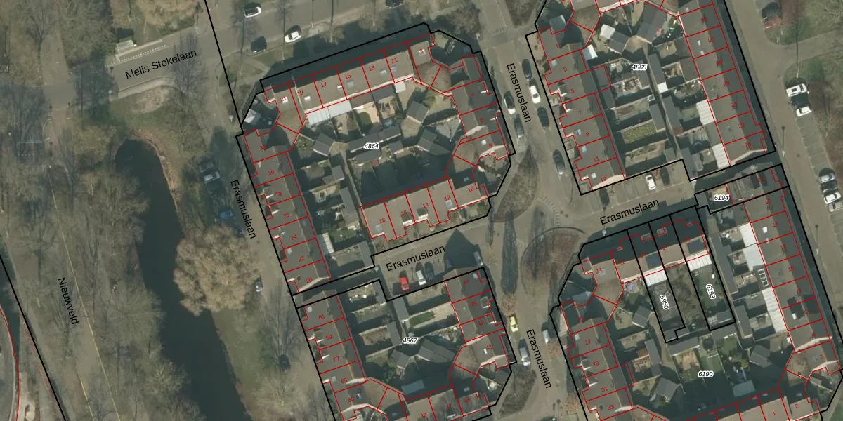 Het perceel waarop Erasmuslaan 14 staat heeft een oppervlakte van 2823 m². Dit is een zeer groot perceel. De perceeloppervlakte wordt geregistreerd door het Kadaster. Gedetailleerde informatie over de maten van dit perceel kunt u vinden in het rapport Kadastrale kaart met maatvoering van Erasmuslaan 14.