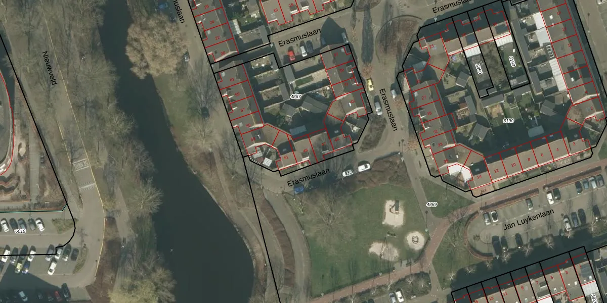 Het perceel waarop Erasmuslaan 49 staat heeft een oppervlakte van 1531 m². Dit is een zeer groot perceel. De perceeloppervlakte wordt geregistreerd door het Kadaster. Gedetailleerde informatie over de maten van dit perceel kunt u vinden in het rapport Kadastrale kaart met maatvoering van Erasmuslaan 49.