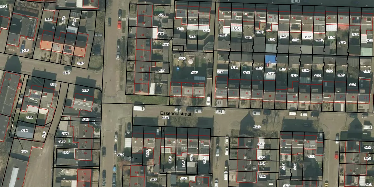 Essehoutstraat 3 is gelegen op kadastraal perceel HMD00T4587. Deze kadastrale aanduiding is uniek en wordt gebruikt door het Kadaster om eigendomsrechten en andere zakelijke rechten vast te leggen. Het perceel maakt onderdeel uit van de kadastrale gemeente Helmond.