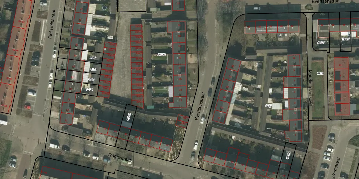 Het perceel waarop Evertsenstraat 23 staat heeft een oppervlakte van 6893 m². Dit is een zeer groot perceel. De perceeloppervlakte wordt geregistreerd door het Kadaster. Gedetailleerde informatie over de maten van dit perceel kunt u vinden in het rapport Kadastrale kaart met maatvoering van Evertsenstraat 23.