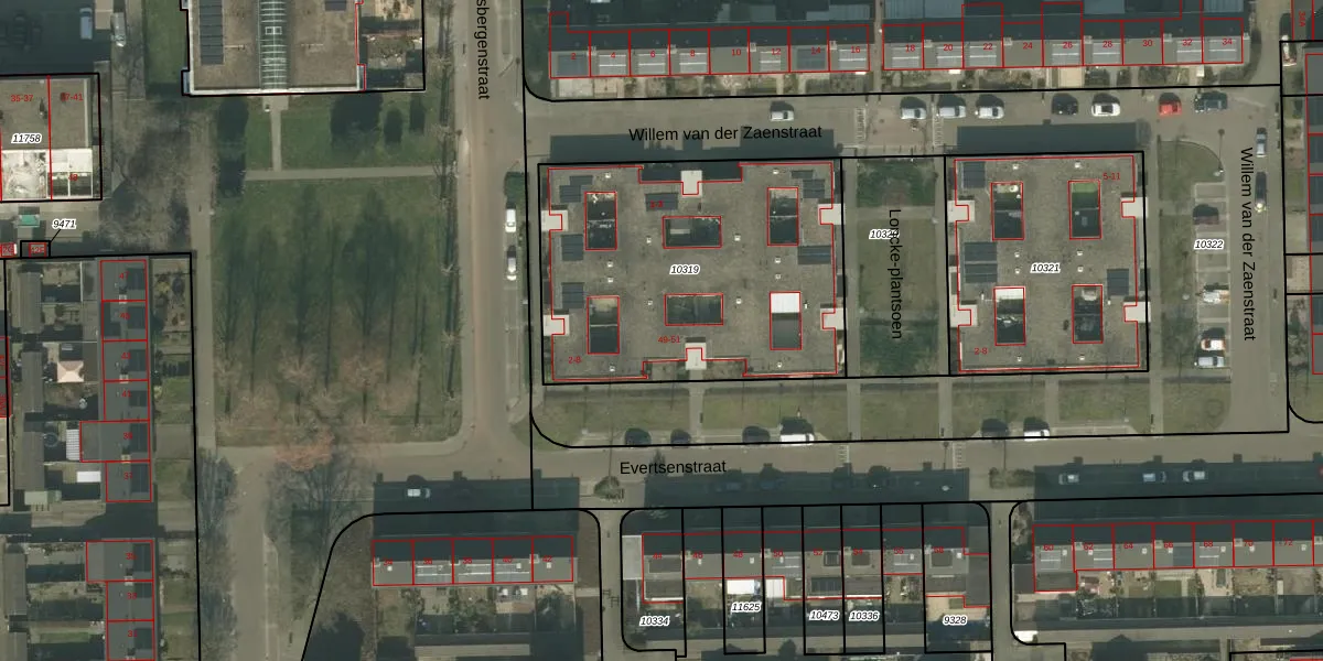 Het perceel waarop Evertsenstraat 49 staat heeft een oppervlakte van 1526 m². Dit is een zeer groot perceel. De perceeloppervlakte wordt geregistreerd door het Kadaster. Gedetailleerde informatie over de maten van dit perceel kunt u vinden in het rapport Kadastrale kaart met maatvoering van Evertsenstraat 49.