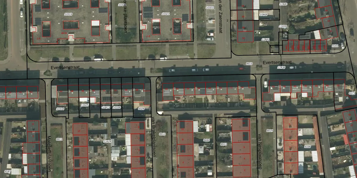 Het perceel waarop Evertsenstraat 62 staat heeft een oppervlakte van 2204 m². Dit is een zeer groot perceel. De perceeloppervlakte wordt geregistreerd door het Kadaster. Gedetailleerde informatie over de maten van dit perceel kunt u vinden in het rapport Kadastrale kaart met maatvoering van Evertsenstraat 62.