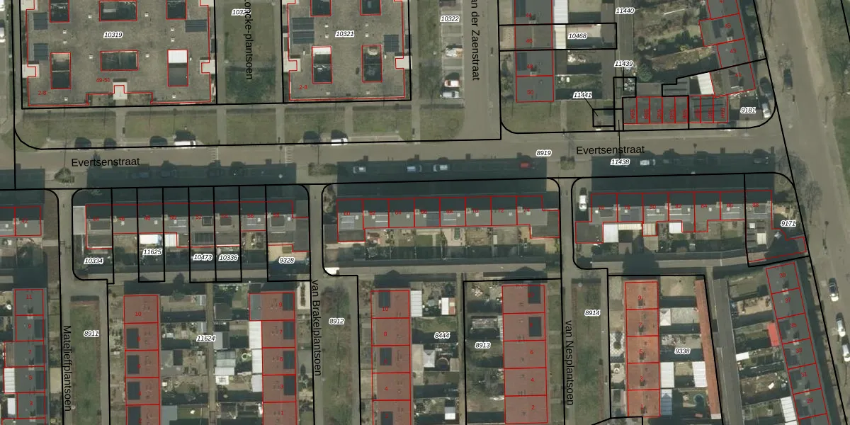 Het perceel waarop Evertsenstraat 66 staat heeft een oppervlakte van 2204 m². Dit is een zeer groot perceel. De perceeloppervlakte wordt geregistreerd door het Kadaster. Gedetailleerde informatie over de maten van dit perceel kunt u vinden in het rapport Kadastrale kaart met maatvoering van Evertsenstraat 66.