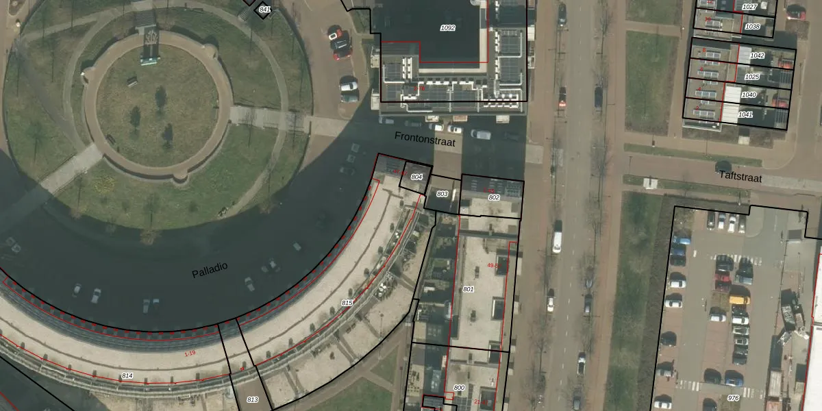 Het perceel waarop Frontonstraat 49 staat heeft een oppervlakte van 1363 m². Dit is een zeer groot perceel. De perceeloppervlakte wordt geregistreerd door het Kadaster. Gedetailleerde informatie over de maten van dit perceel kunt u vinden in het rapport Kadastrale kaart met maatvoering van Frontonstraat 49.