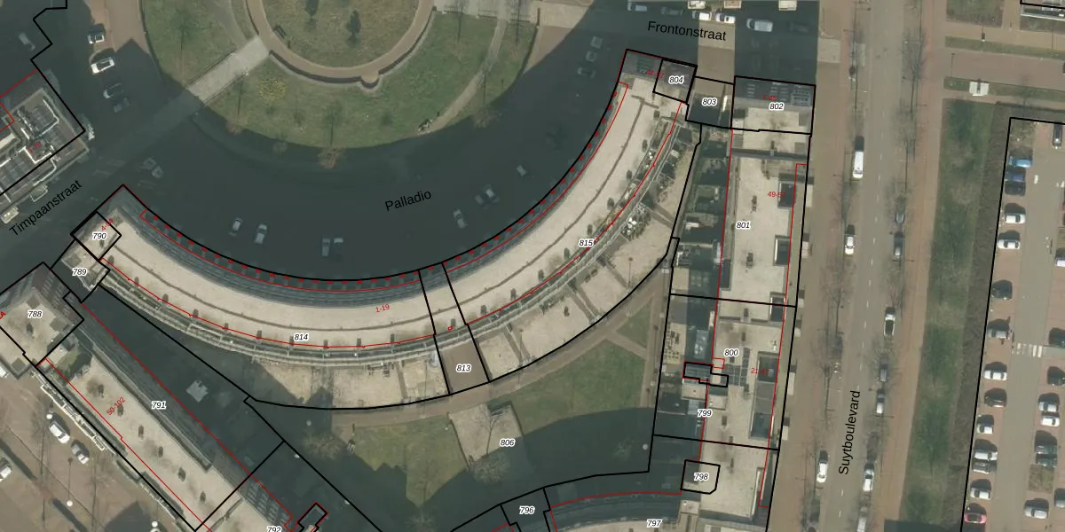 Het perceel waarop Frontonstraat 71 staat heeft een oppervlakte van 1363 m². Dit is een zeer groot perceel. De perceeloppervlakte wordt geregistreerd door het Kadaster. Gedetailleerde informatie over de maten van dit perceel kunt u vinden in het rapport Kadastrale kaart met maatvoering van Frontonstraat 71.
