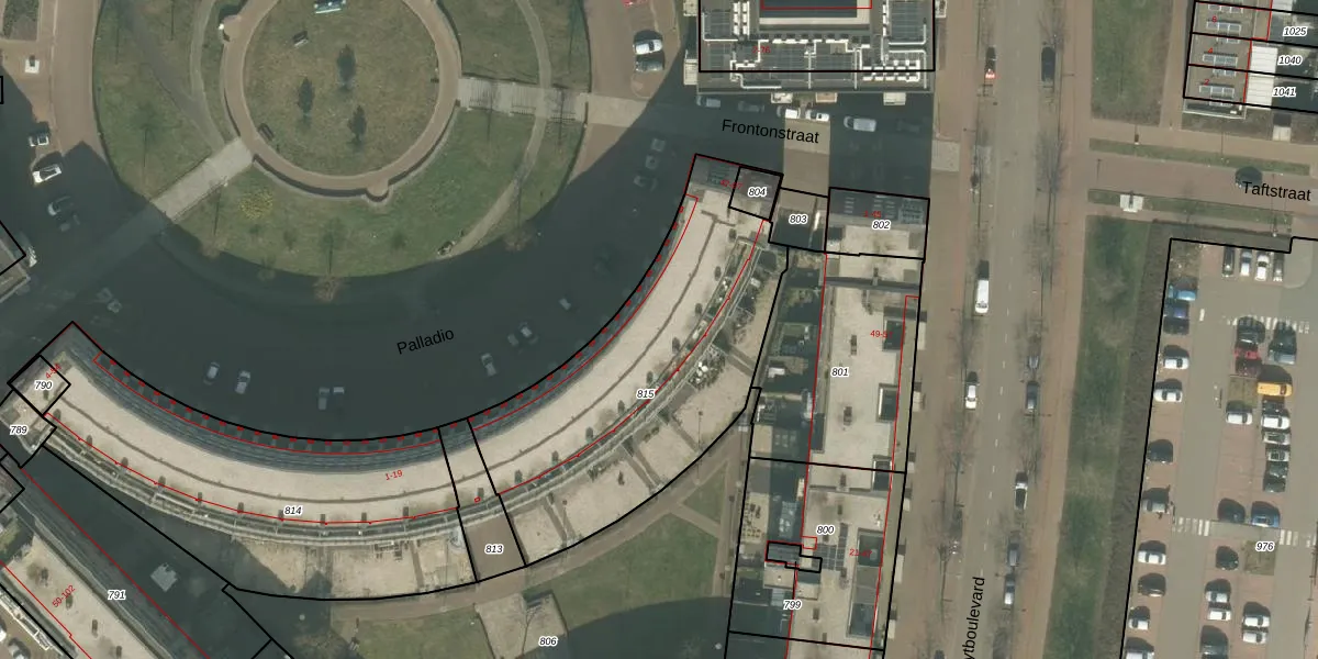 Het perceel waarop Frontonstraat 85 staat heeft een oppervlakte van 1363 m². Dit is een zeer groot perceel. De perceeloppervlakte wordt geregistreerd door het Kadaster. Gedetailleerde informatie over de maten van dit perceel kunt u vinden in het rapport Kadastrale kaart met maatvoering van Frontonstraat 85.
