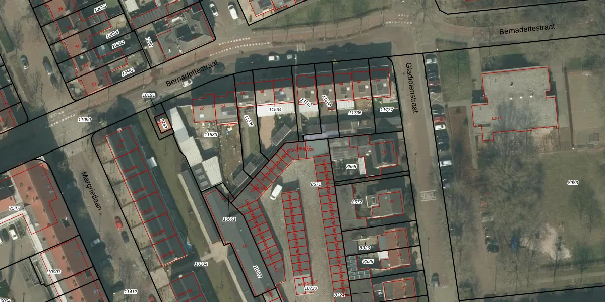 Het perceel waarop Gladiolenstraat 5-A-27 staat heeft een oppervlakte van 2128 m². Dit is een zeer groot perceel. De perceeloppervlakte wordt geregistreerd door het Kadaster. Gedetailleerde informatie over de maten van dit perceel kunt u vinden in het rapport Kadastrale kaart met maatvoering van Gladiolenstraat 5-A-27.
